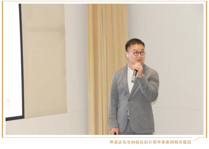 随后,华美国际投资集团高级副总裁,金融投资事业部总经理、财富中心总经理黄首达先生为大家做华美集团相关情况的介绍,通过介绍,各位校友对整个华美的业务版块有了更加清晰的了解,今后希望能与校友们有更多互促共进,资源共享的机会。