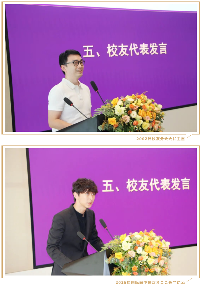 2002届校友分会会长王嘉、2025届国际高中校友分会会长兰皓添作为校友代表上台发言,他们表示母校是校友们梦想的起点,珍藏着校友们最美的青春年华。无论身在何方,母校始终是心底最温暖的牵挂。校友会不仅是连接过往与现在的桥梁,更是凝聚校友力量、汇聚智慧资源的平台。校友们都希望尽已之力,以积极创新服务的方式,参与校友会的各项活动,加强校友与母校间的的联络,支持母校建设与发展,共同书写母校与校友发展的新篇章!