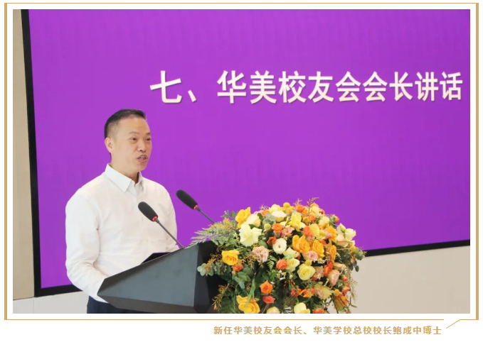 新任华美校友会会长、华美学校总校校长鲍成中博士登台讲话。他表示我们全球1.7万名校友,是华美教育理念最生动的证明,也是学校最宝贵的财富。面对如此庞大而优秀的校友群体,新一届理事会将秉持"凝聚、赋能、共赢"的理念,重点通过以下路径开展工作:第一,构建全球资源共享平台,释放1.7万人的集体能量。第二,打造多元社团生态系统,激活校友网络内生动力。第三,建立全周期赋能体系,助力校友终身成长。1.7万人不仅是一个数字,更代表着巨大的能量和无限的可能。我们每个人都是华美这张名片上不可或缺的一笔,都是这个大家庭中重要的一员。新一届理事会将努力让每一位校友都能在校友会中找到归属感、获得成长力、实现新发展。