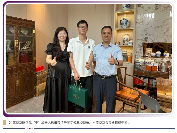 校友是学校宝贵的财富,更是连接校园与社会的重要桥梁。近日,华美学校总校校长、华美校友会会长鲍成中博士一行专程走访了2004届优秀校友陈创武的企业,校友陈创武夫妇热情接待来访的校友会领导、成员。