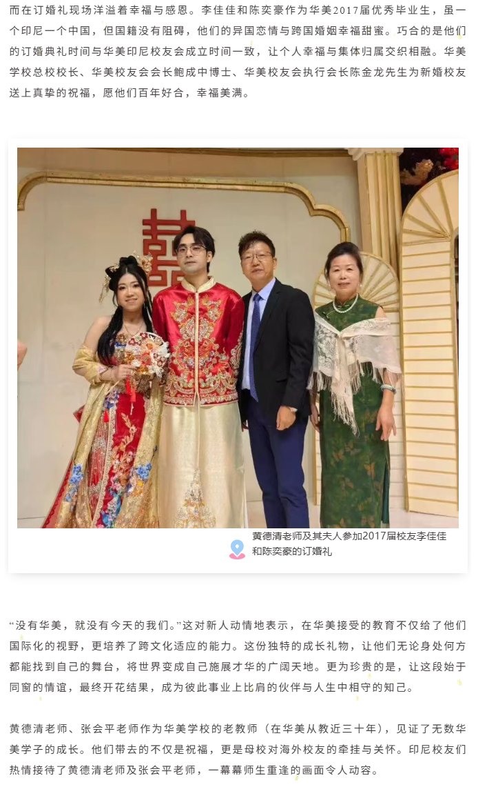 华美老教师代表黄德清老师、张会平老师受学校委托及校友李佳佳、陈奕豪邀请,远赴印尼参加这场双喜临门的盛会,带去了华美母校和全体老师对海外校友的深切牵挂与真挚祝福。