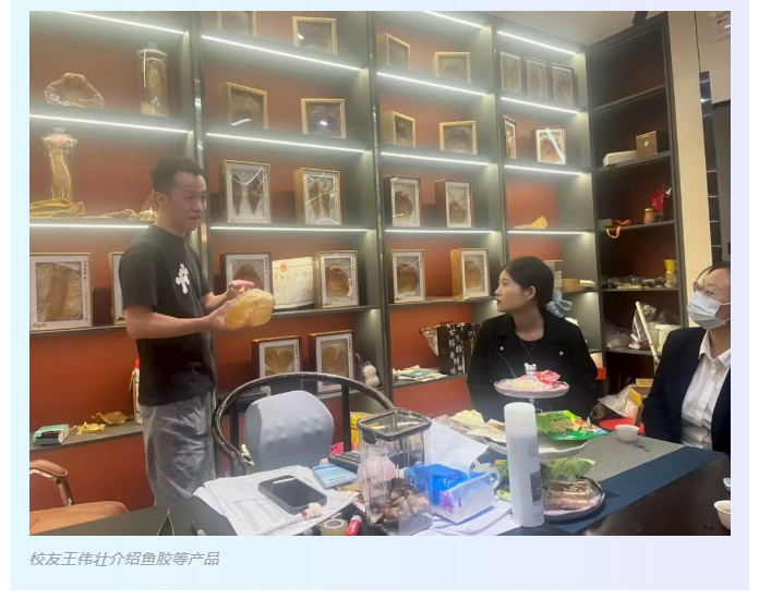 走访过程中,鲍成中会长细致地参观了企业的展示空间,聆听了王伟壮校友关于企业经营、品牌故事与行业前景的分享。一盒盒品质上乘的鱼胶,不仅是滋补佳品,更是王家两代人匠心精神的凝结。鲍成中会长对王伟壮校友对父辈传承下来的事业能如此用心表示赞赏,他动情地说:“看到我们的校友在各自领域深耕不辍,将事业做得如此出色,我们感到无比的骄傲与自豪!学校如今在注重科创教育的同时,也十分注重中国传统文化与工艺的传承,希望校友王伟壮能回校给学生们讲讲相关的中国传统的食育文化和技艺。”